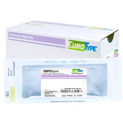ЕВРОКРИЛ – рассасывающийся стерильный хирургический шовный материал ПГА. Нить полифиламентная комплексная (плетеная с покрытием) из полиглактина 910 (гликолид 90%, лактид 10%), покрытие из сополимера гликолида (30%), лактида(70%) и стеарата кальция (0,99%)). Рассасывание материала происходит посредством гидролиза. Срок рассасывания средний. Полностью материал рассасывается между 56-80 сутками. Для лучшей идентификации нить окрашена в фиолетовый цвет. Игла атравматическая Premium из нержавеющей стали. Высокое качество полировки и специальное соединение нити снижает вероятность травмирования сшиваемых тканей.