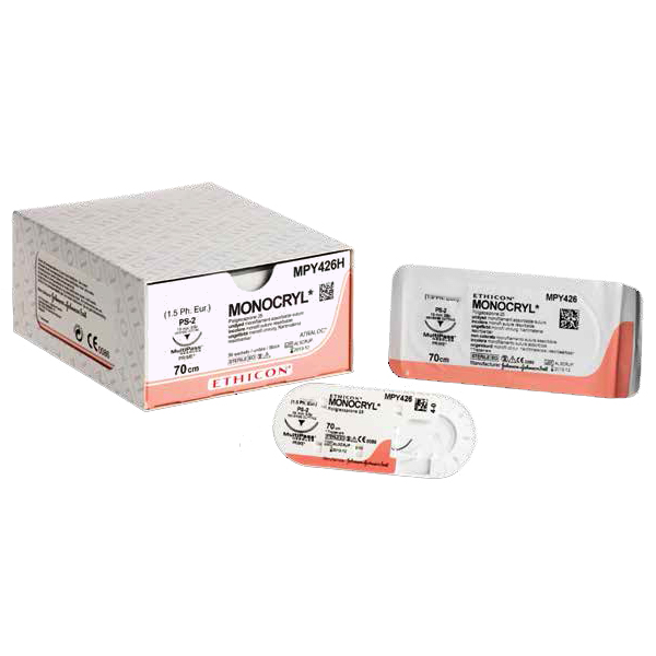 MONOCRYL* – монофиламентный синтетический рассасывающийся шовный материал. Нить MONOCRYL* очень мягкая и эластичная, удобная в обращении. Используется для аппроксимации мягких тканей и наложения лигатур в общей хирургии, абдоминальной хирургии, акушерстве и гинекологии, урологии, а также пластической хирургии. MONOCRYL* оптимально подходит для ушивания кожи, для наложения швов на тонкий и толстый кишечник, брюшину, мочевой пузырь и мочеточники, промежность, влагалище (эпизиотомия), крайнюю плоть (циркумцизия).
