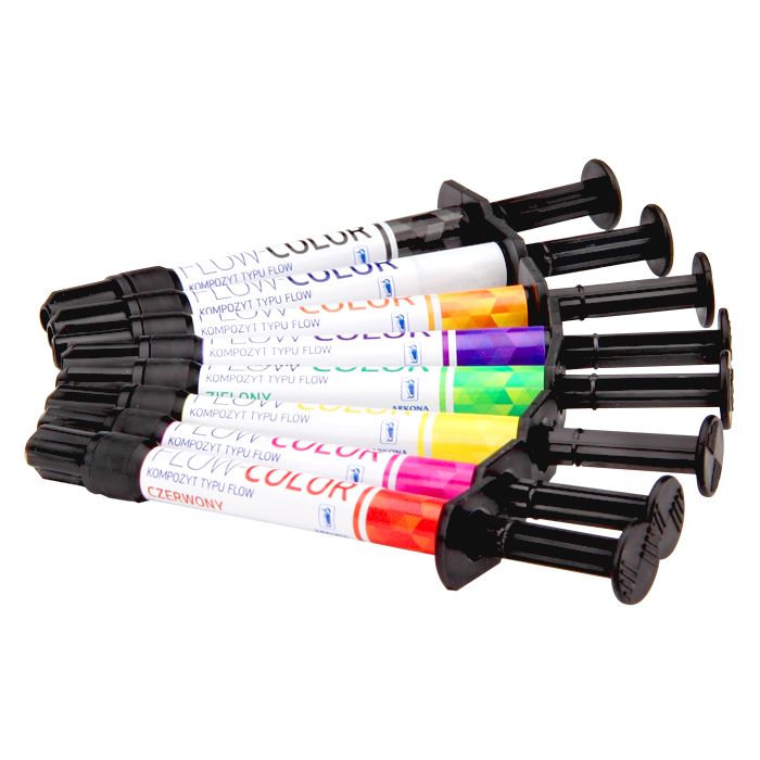 Flow-Color - цветной, микрогибридный, светоотверждаемый композит типа „flow” c фтором. Производится с мыслью о самых маленьких пациентах. Применяется в качестве герметика для фиссур и в терапевтической стоматологии.