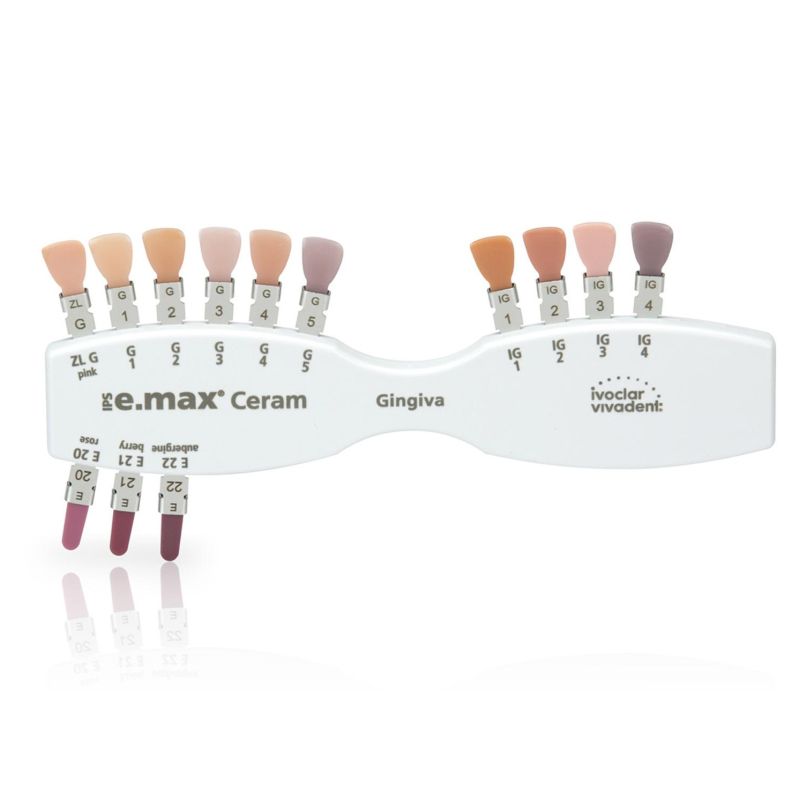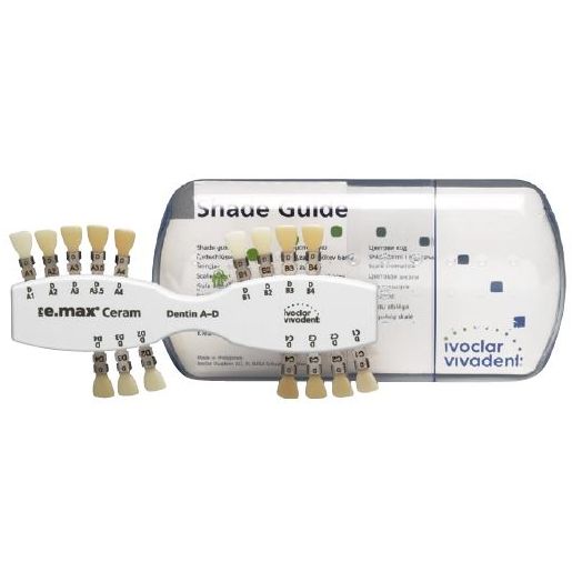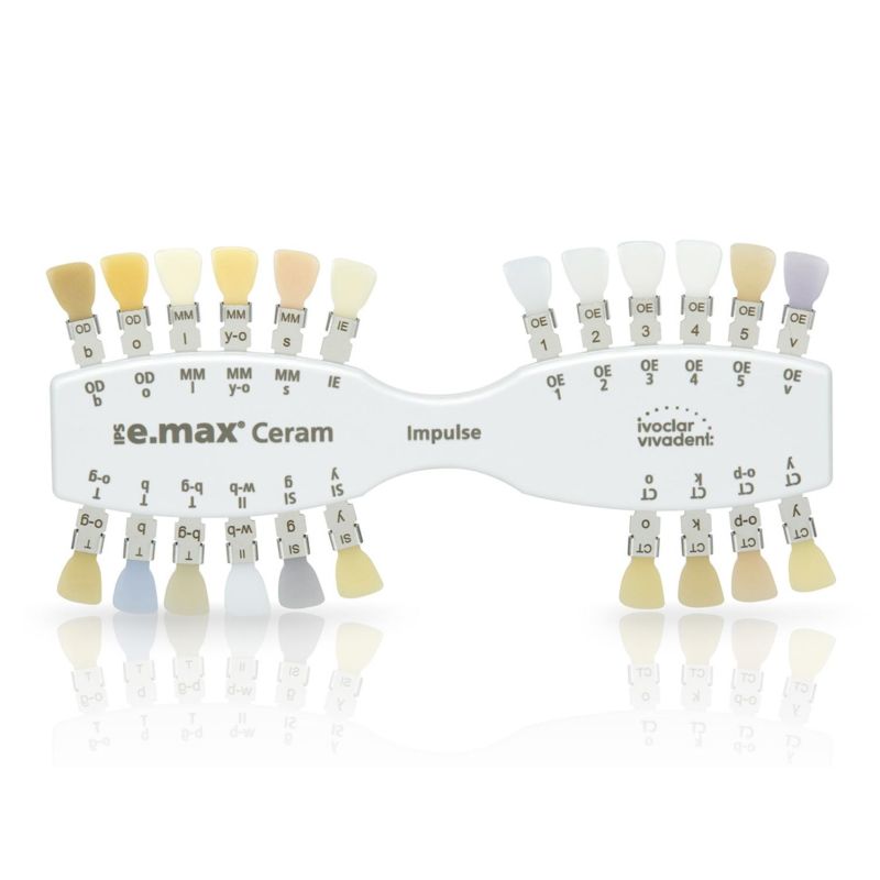 Расцветки IPS e.max Ceram являются неотъемлемой частью концепции материала. Для естественного преломления света образцам дентиновой расцветки была придана анатомическая форма и созданы структуры на поверхности. Все остальные образцы имеют слегка клиновидную форму для лучшей иллюстрации полупрозрачности отдельных масс. Во избежание путаницы с расцветками других материалов (например, IPS d.SIGN, IPS InLine, SR Adoro) стержни и держатели расцветок IPS e.max Ceram имеют светло-серый цвет.