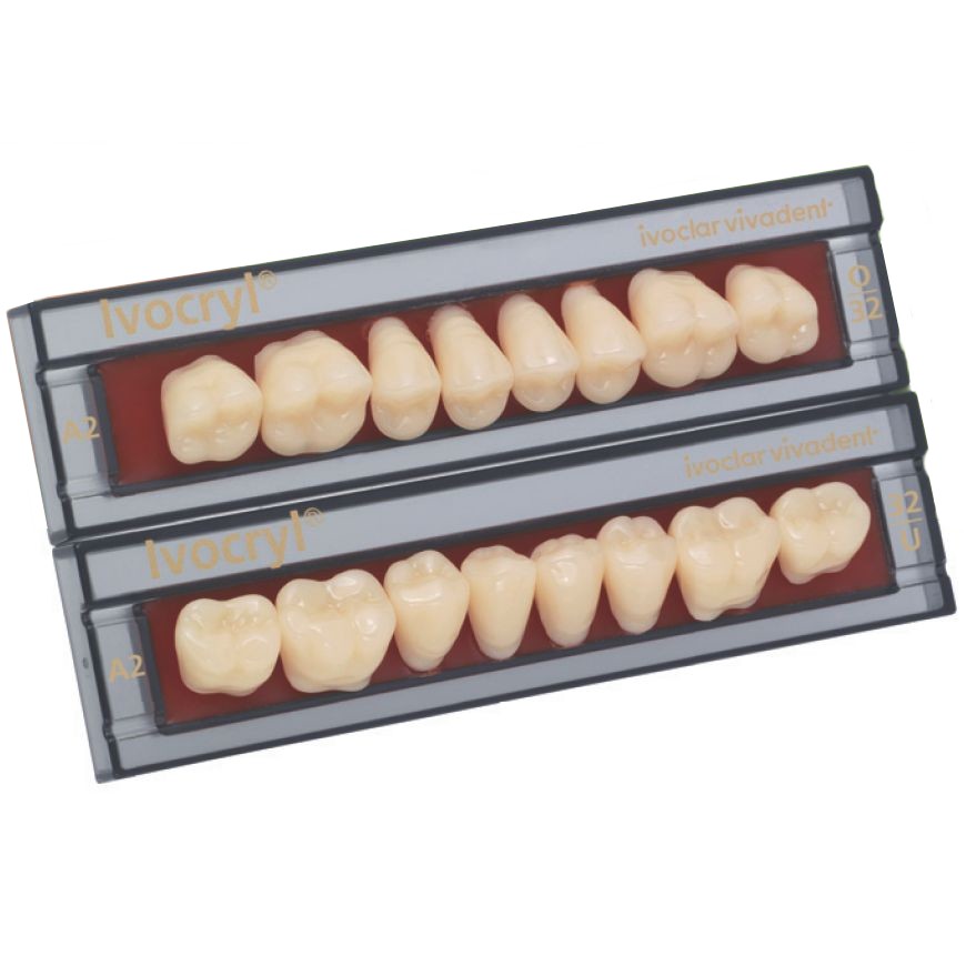 Основой пластмассовых зубов Ivocryl является давно зарекомендовавший себя материал PMMA, он хорошо совместим с мягкими тканями, устойчив к образованию налета, обладает стабильным цветом. Зубы Ivocryl выпускаются в 16 цветах A-D, 4 цветах Bleach